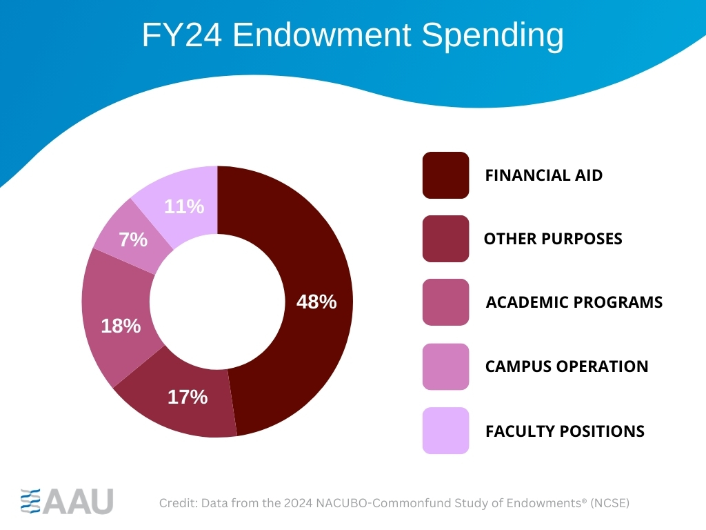 An endowment is an investment fund for a university that is really a collection of charitable donations – and many of those funds are restricted for specific purposes (like scholarships or cancer research). The returns from these investments are used to support student financial aid, provide long-term sustainable support for crucial scientific research, and subsidize many of the university’s other expenses – thus reducing the need for the school to get its operating revenue through other streams, like tuition hikes. In fact, in FY24 colleges and universities invested 66% of their endowment funds in student financial aid and academic programs. These increased investments by the institutions make college free or low-cost for thousands of low- and moderate-income students through endowment-supported scholarships and grants.