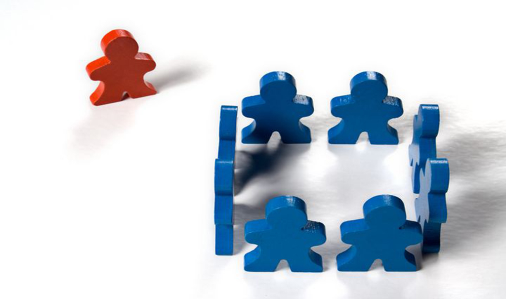 A lonely figurine oversees a group of friendly figurines.