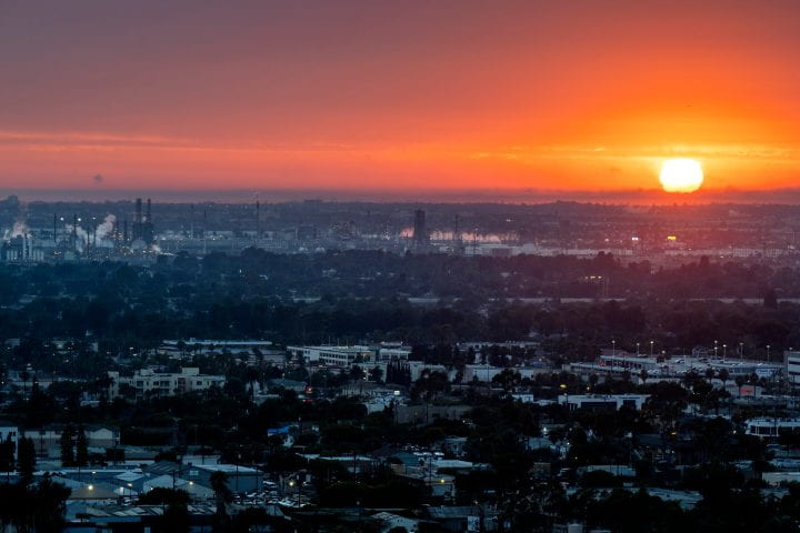 The sun sets over an expanse of greater Los Angeles that is occupied by one of the region’s many oil refineries, a source of carbon dioxide pollution. Study co-author Claudia Czimczik says, “Our method successfully captures these patterns, but we need to test it in other cities … to understand if it works as well in places where emissions are subject to more consistent wind transport, rather than the mountain and basin situation we see in Los Angeles.” Steve Zylius / UC Irvine